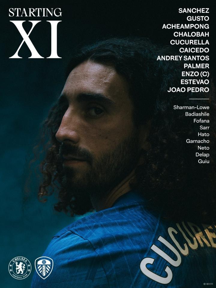 切尔西首发:1-桑切斯、27-古斯托、34-阿昌庞、23-查洛巴、3-库库雷利亚、17-桑托斯、25-凯塞多、41-埃斯特旺、10-帕尔默、8-恩佐、20-佩德罗