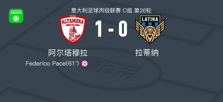 阿尔塔穆拉1-0拉蒂纳取意丙3连胜战报bot @懂球帝02-11 02:53北京时间2月11日意大利足球丙级联赛 C组 第26轮,阿尔塔穆拉主场对阵拉蒂纳。拉蒂纳Federico Pace自摆乌龙。最终比分阿尔塔穆拉 1-0 拉蒂纳。点击查看本场比赛详细数据>>点击查看意丙完整积分榜>>精彩瞬间第61分钟,拉蒂纳球员Federico Pace自摆乌龙。 球队阵容 技术统计 展开更多