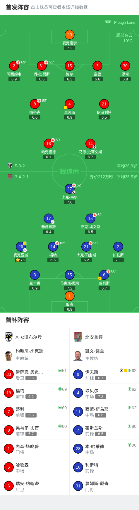 北京时间2月11日英格兰联赛锦标赛 1/4决赛,AFC温布尔登对阵北安普顿。AFC温布尔登马修-史蒂文斯破门。北安普顿杰克-韦尔破门,伊夫斯破门。最终比分AFC温布尔登 1-2 北安普顿。