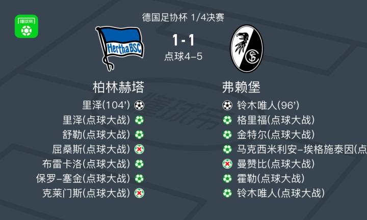 弗赖堡总分6-5点杀柏林赫塔,铃木唯人破僵,里泽破门战报bot @懂球帝02-11 05:39北京时间2月11日德国足协杯 1/4决赛,柏林赫塔对阵弗赖堡。柏林赫塔里泽破门。弗赖堡铃木唯人破门。最终比分柏林赫塔 1-1 弗赖堡,点球大战柏林赫塔4-5弗赖堡,最终总分弗赖堡6-5柏林赫塔。点击查看本场比赛详细数据>>点击查看德国杯完整积分榜>>精彩瞬间第96分钟,弗赖堡球员铃木唯人打入一球。第104分钟,柏林赫塔球员保罗-塞金助攻里泽打入一球。球队阵容技术统计展开更多