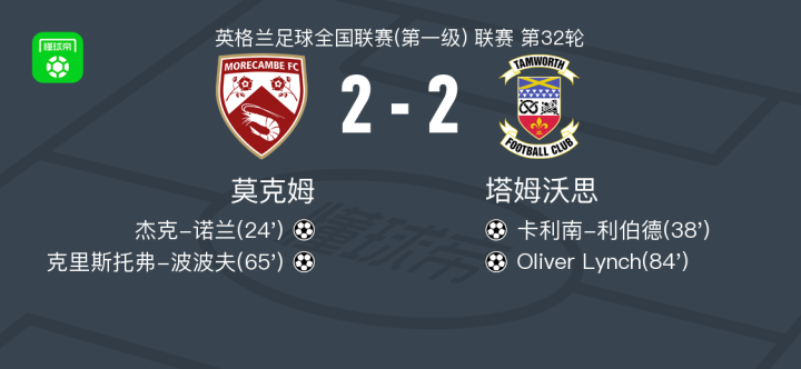 北京时间2月11日英格兰足球全国联赛(第一级) 联赛 第32轮,莫克姆主场对阵塔姆沃思。莫克姆杰克-诺兰破门,克里斯托弗-波波夫破门。塔姆沃思卡利南-利伯德破门,Oliver Lynch破门。最终比分莫克姆 2-2 谭禾夫。