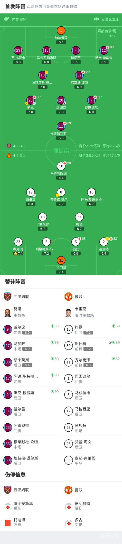 北京时间2月11日英格兰足球顶级联赛第26轮,西汉姆联主场对阵曼联。上半场B费吊射险破门,万-比萨卡门线救险,下半场绍切克破门,卡塞米罗破门被吹,谢什科补时绝平。最终比分西汉姆联 1-1 曼联。