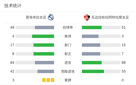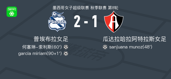 普埃布拉女足2-1逆转瓜达拉哈拉阿特拉斯女足,garcia miriam破门,何塞琳-索利斯建功