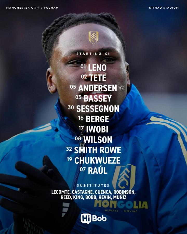 富勒姆首发:1-莱诺、2-泰特、5-约西姆-安诺生、3-巴锡、30-瑞安-塞塞尼翁、16-桑德-贝格、17-伊沃比、8-哈里-威尔逊、32-史密斯-罗、19-丘库埃泽、7-劳尔-希门尼斯
