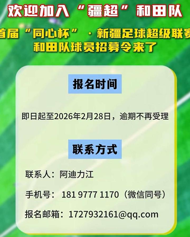 马不停蹄!2月9日,新疆发布2026年十件民生实事具体内容,其中确定将举办“疆超”赛事。次日,新疆和田地区文旅官方账号发布招募令,将组建和田队参加“疆超”。 截至目前,和田地区共有两支球队曾冲刺过中冠联赛,分别是和田玉城及于田万方。2025年11月,和田宇宙地毯队首夺新疆最火爆足球赛事“阿图什杯”的冠军,此次和田地区组建队伍参加“疆超”赛事,将成为和田足球崭新的一次突破。