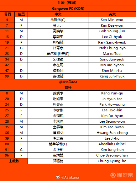 2025-26赛季亚冠精英联赛 联赛阶段 江原vs上海海港 首发名单