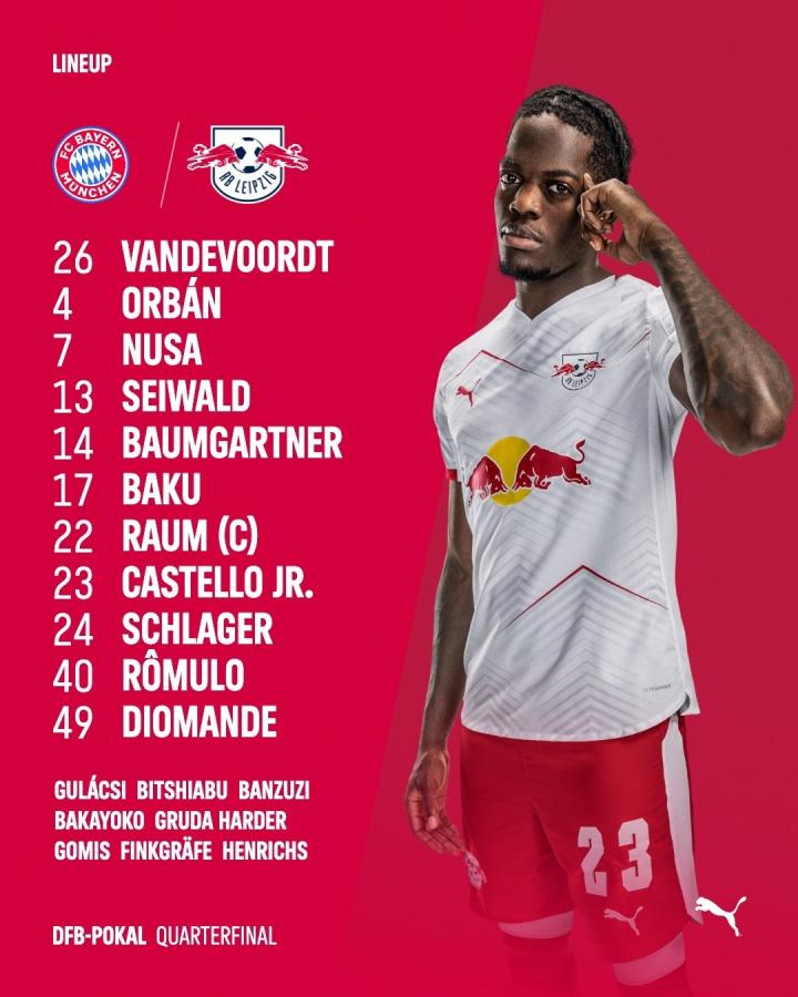 莱比锡首发:26-范德沃特、17-巴库、4-奥尔班、23-卢克巴、22-劳姆、24-施拉格尔、13-赛瓦尔德、14-鲍姆加特纳、49-扬-迪奥曼德、40-罗慕洛、7-努萨