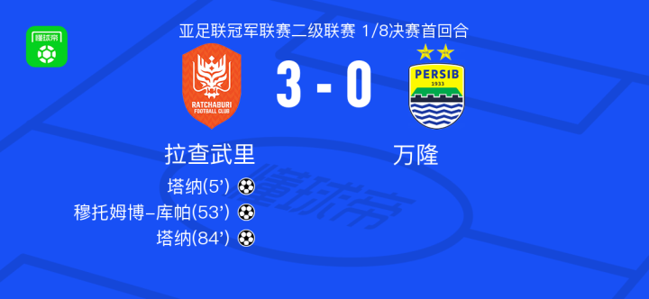 北京时间2月11日亚足联冠军联赛二级联赛 1/8决赛首回合,拉查武里对阵万隆。拉查武里塔纳梅开二度,穆托姆博-库帕破门。最终比分拉查武里 3-0 万隆。