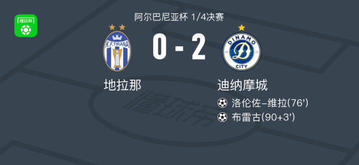 北京时间2月11日阿尔巴尼亚杯 1/4决赛,地拉那对阵迪纳摩城。迪纳摩城洛伦佐-维拉破门,布雷古破门。最终比分地拉那 0-2 迪纳摩城。