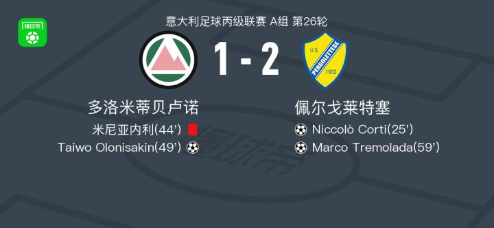 北京时间2月12日意大利足球丙级联赛 A组 第26轮,多洛米蒂贝卢诺主场对阵佩尔戈莱特塞。多洛米蒂贝卢诺Taiwo Olonisakin破门。佩尔戈莱特塞Niccolò Corti破门,Marco Tremolada破门。最终比分多洛米蒂贝卢诺 1-2 佩尔戈莱特塞。