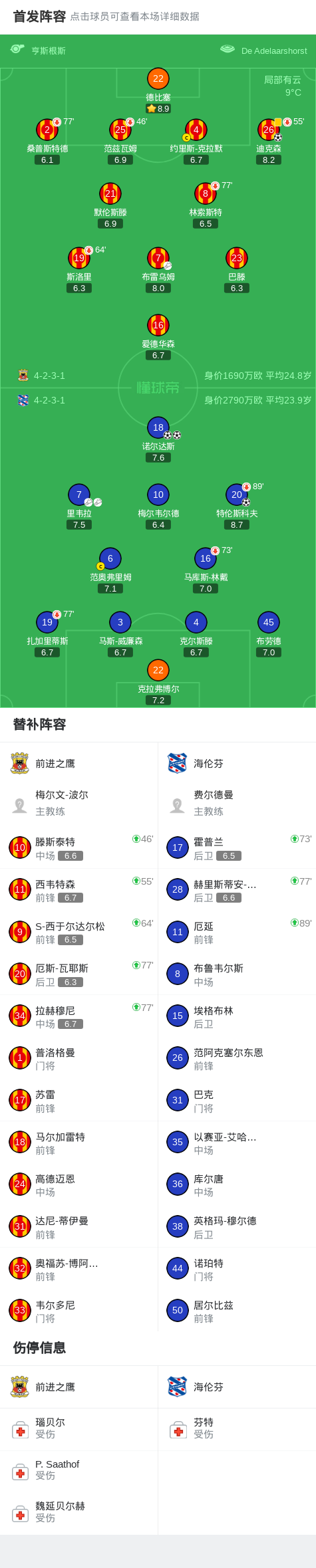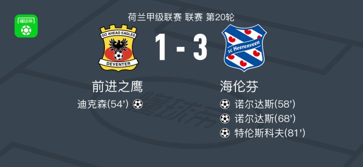 北京时间2月12日荷兰甲级联赛 联赛 第20轮,前进之鹰主场对阵海伦芬。前进之鹰迪克森破门。海伦芬诺尔达斯梅开二度,特伦斯科夫破门。最终比分前进之鹰 1-3 海伦芬。