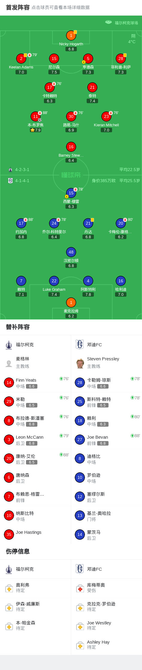 福尔柯克1-0邓迪FC,本-布罗焦打进全场唯一进球战报bot @懂球帝02-12 05:38北京时间2月12日苏格兰顶级联赛 联赛 第26轮,福尔柯克主场对阵邓迪FC。福尔柯克本-布罗焦破门。最终比分福尔柯克 1-0 邓迪FC。点击查看本场比赛详细数据>>点击查看苏超完整积分榜>>精彩瞬间第55分钟,福尔柯克球员本-布罗焦打入一球。下半场补时第5分钟,邓迪FC球员丹达将点球罚丢。 球队阵容 技术统计 展开更多