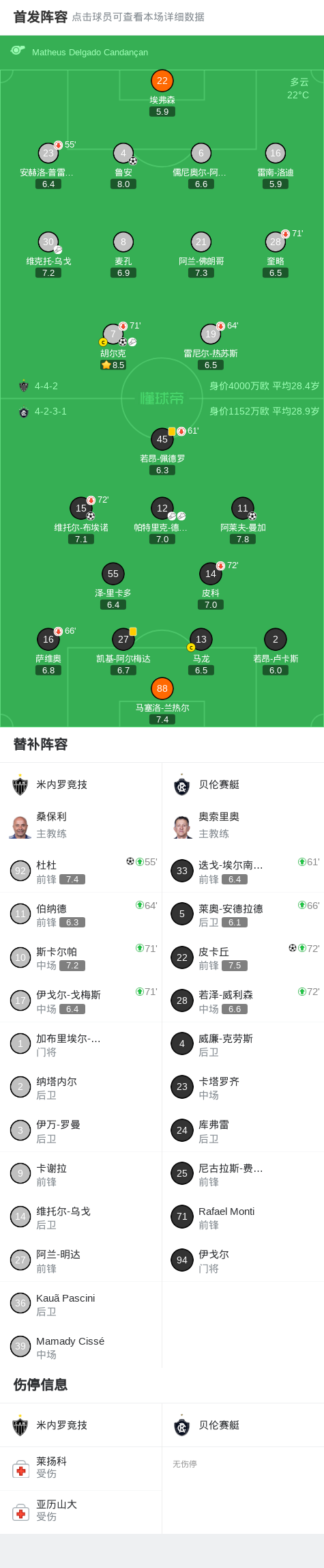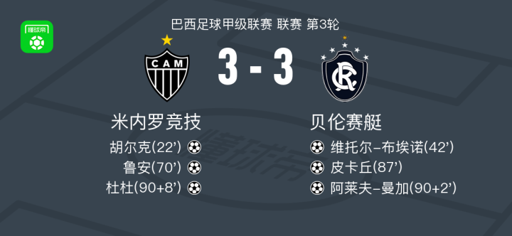 北京时间2月12日巴西足球甲级联赛 联赛 第3轮,米内罗竞技主场对阵贝伦赛艇。米内罗竞技胡尔克破门,鲁安破门,杜杜破门。贝伦赛艇维托尔-布埃诺破门,皮卡丘破门,阿莱夫-曼加破门。最终比分米内罗竞技 3-3 贝伦赛艇。