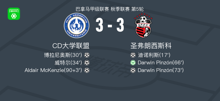 北京时间2月12日巴拿马甲级联赛 秋季联赛 第5轮,CD大学联盟主场对阵圣弗朗西斯科。CD大学联盟博拉尼奥斯破门,威特尔破门,Aldair McKenzie破门。圣弗朗西斯科迪诺利斯破门,Darwin Pinzón梅开二度。最终比分CD大学联盟 3-3 圣弗朗西斯科。