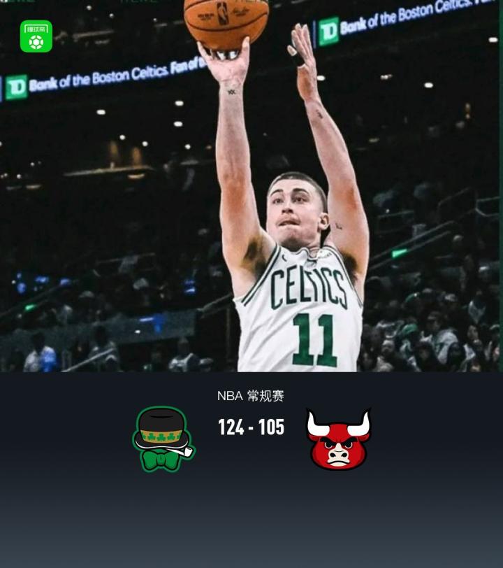 第四节,前半节凯尔特人继续主力在场维持30分上下领先,随后进入练兵时间,凯尔特人普理查德继续在场,最终凯尔特人124-105战胜公牛。