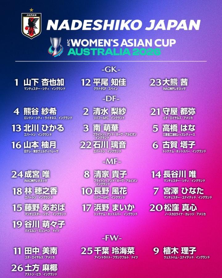 北京时间2月12日,日本女足公布了女足亚洲杯的26人大名单,其中22名留洋球员入选。日本女足在亚洲杯与中国台北女足、印度女足与越南女足同组。