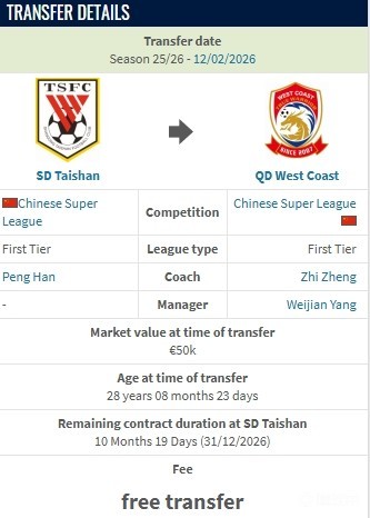 德转:山东泰山门将刘世博自由转会青岛西海岸盖坦92026-02-12 18:14北京时间2月12日,德转更新,山东泰山门将刘世博自由转会青岛西海岸。刘世博现年28岁,司职门将。在2023赛季球员离开广州队(已解散),加盟山东泰山,效力期间共出场6次,完成1次零封。在2025赛季下半程球员租借加盟青岛红狮,期间共出场12次。德转显示,刘世博为自由转会至青岛西海岸,此前球员与山东泰山还有一个赛季的合同。现在他的身价为5万欧元。展开更多