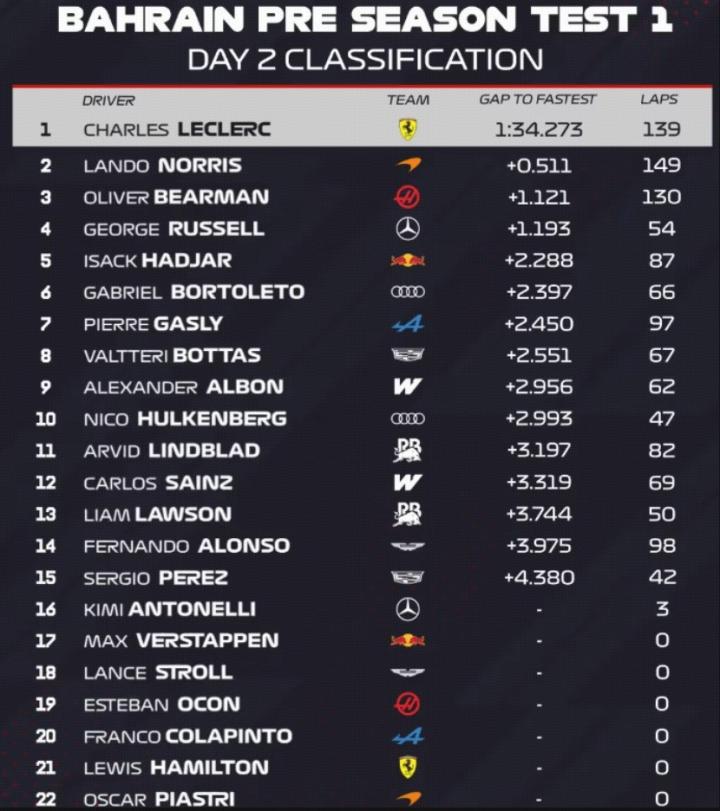 F1巴林测试Day2:勒克莱尔1分34秒273最快,诺里斯最多圈