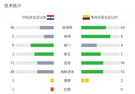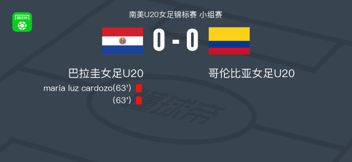 巴拉圭女足U20 0-0哥伦比亚女足U20,秋色平分战报bot @懂球帝02-13 06:52北京时间2月13日南美U20女足锦标赛 小组赛,巴拉圭女足U20对阵哥伦比亚女足U20。最终比分巴拉圭女足U20 0-0 哥伦比亚女足U20。点击查看本场比赛详细数据>>精彩瞬间第63分钟,巴拉圭女足U20球队maria luz cardozo吃到红牌。第63分钟,巴拉圭女足U20球队吃到红牌。 技术统计 展开更多