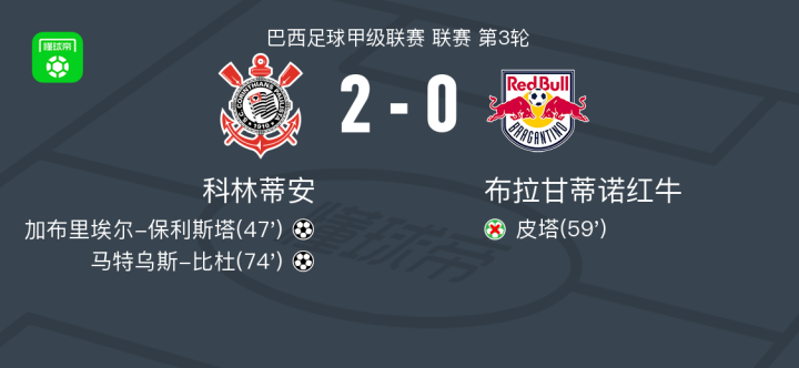 科林蒂安2-0布拉甘蒂诺,加布里埃尔-保利斯塔破门,马特乌斯-比杜锁定胜局