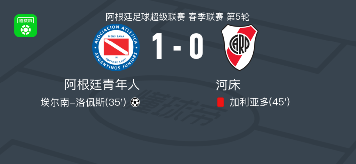 北京时间2月13日阿根廷足球超级联赛 春季联赛 第5轮,阿根廷青年人主场对阵河床。阿根廷青年人埃尔南-洛佩斯破门。最终比分阿根廷青年人 1-0 河床。