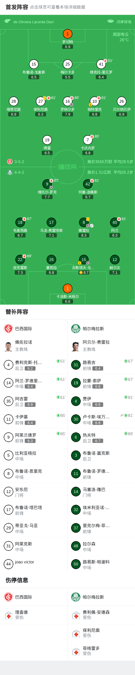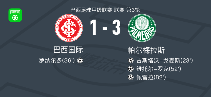 北京时间2月13日巴西足球甲级联赛 联赛 第3轮,巴西国际主场对阵帕尔梅拉斯。巴西国际罗纳尔多破门。帕尔梅拉斯古斯塔沃-戈麦斯破门,维托尔-罗克破门,佩雷拉破门。最终比分巴西国际 1-3 帕尔梅拉斯。