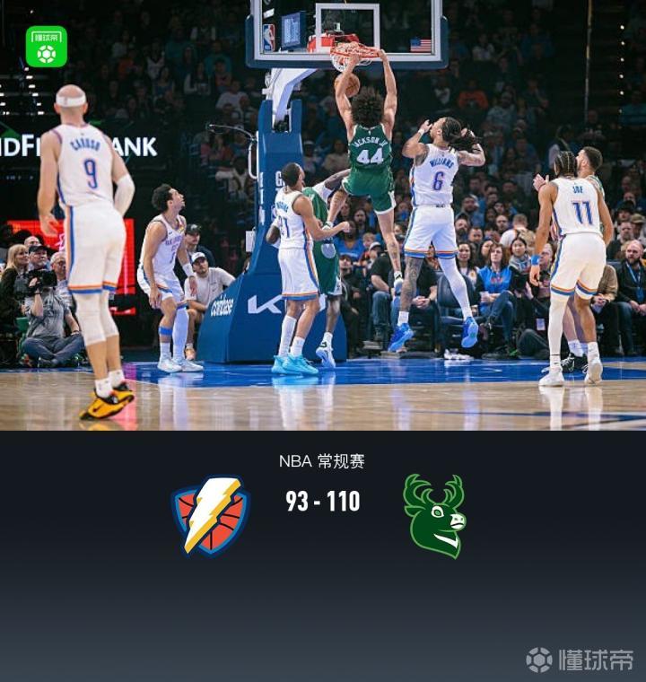 第四节雷霆以赛亚-乔拿下6分,雄鹿AJ-格林拿下5分,最终雷霆93-110不敌雄鹿