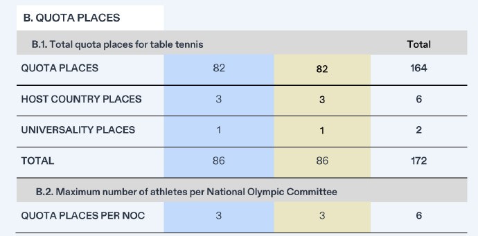 洛奥乒乓球项目男女各限3人参赛,运动员必须承担兼项压力gaoniu @懂球帝02-13 16:192月13日,2028洛杉矶奥运会乒乓球资格体系配额及项目规格出炉,男女各限3人参赛,这意味着运动员必须承担兼项压力。【项目总体配额】男子86人、女子86人,共计172人相关链接:【官方:洛杉矶奥运新增乒乓球混团项目,男、女双打取代男、女团体】【单个协会人数上限】男子3人、女子3人,共计6人【单打规格】64人【双打规格】16对【混团规格】16队 展开更多