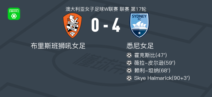 北京时间2月13日澳大利亚女子足球W联赛 联赛 第17轮,布里斯班狮吼女足主场对阵悉尼女足。悉尼女足霍克斯比破门,薇拉-皮尔逊破门,赖利-坦纳破门,Skye Halmarick破门。最终比分布里斯班狮吼女足 0-4 悉尼女足。