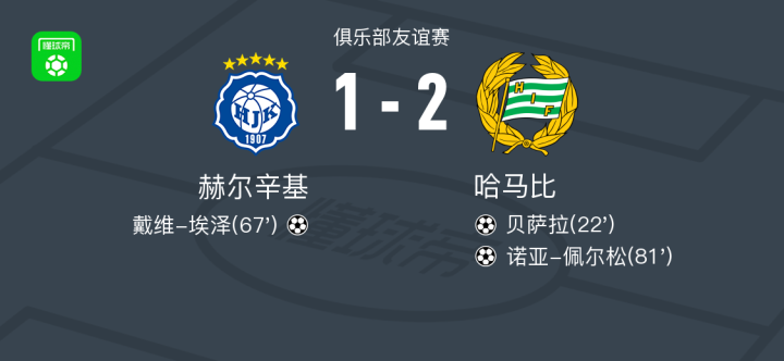 北京时间2月13日俱乐部友谊赛,赫尔辛基对阵哈马比。赫尔辛基戴维-埃泽破门。哈马比贝萨拉破门,诺亚-佩尔松破门。最终比分赫尔辛基 1-2 哈马比。