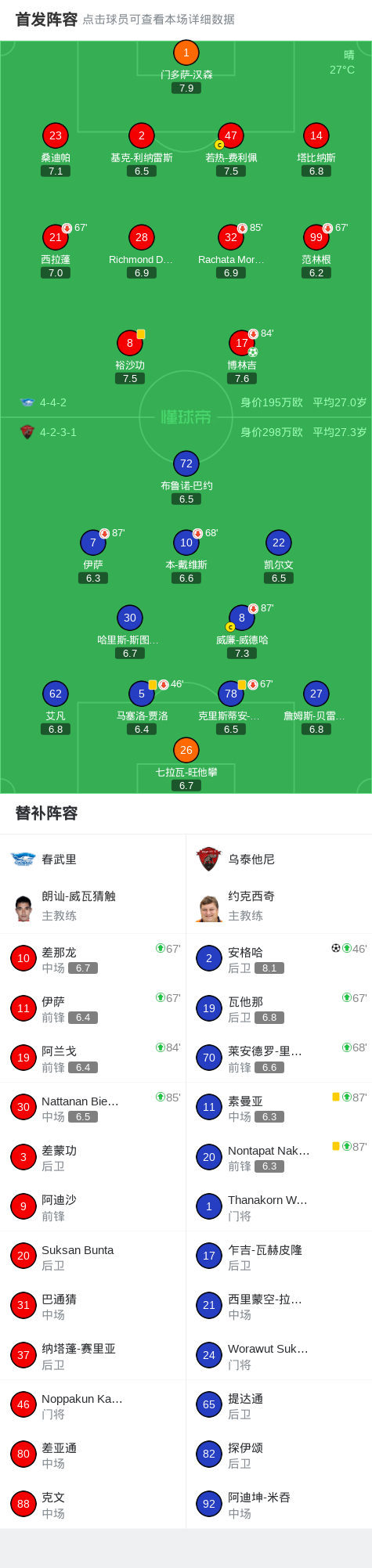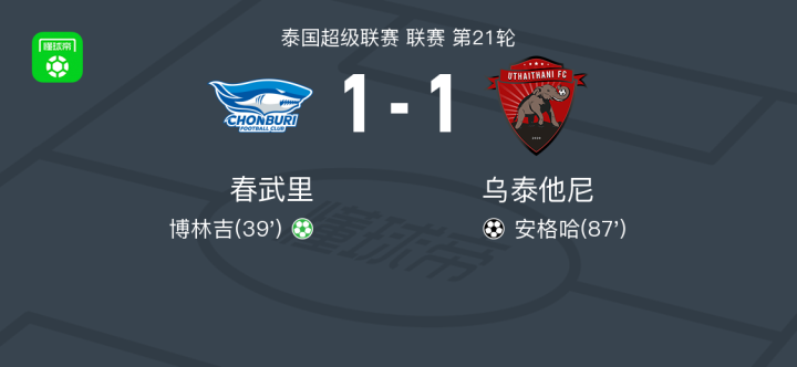 北京时间2月13日泰国超级联赛 联赛 第21轮,春武里主场对阵乌泰他尼。春武里博林吉破门。乌泰他尼安格哈破门。最终比分春武里 1-1 乌泰他尼。
