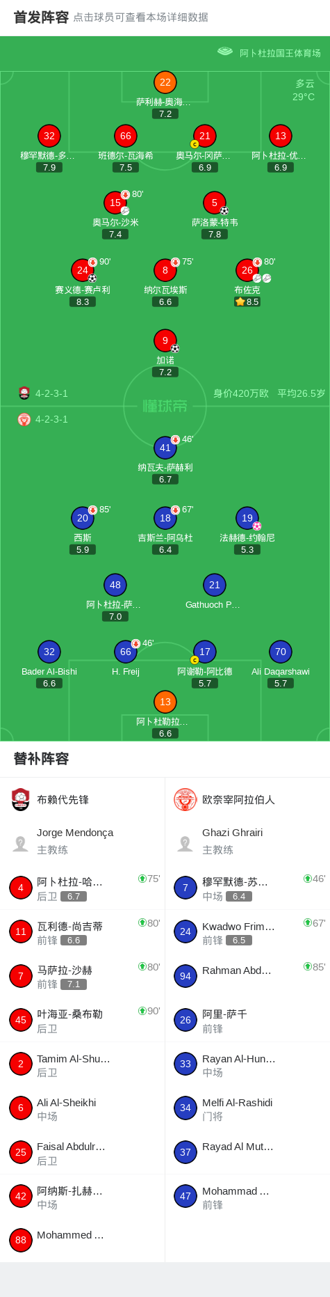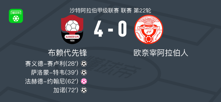 北京时间2月13日沙特阿拉伯甲级联赛 联赛 第22轮,布赖代先锋主场对阵欧奈宰阿拉伯人。布赖代先锋赛义德-赛卢利破门,萨洛蒙-特韦破门,加诺破门。欧奈宰阿拉伯人法赫德-约翰尼自摆乌龙。最终比分布赖代先锋 4-0 欧奈宰阿拉伯人。
