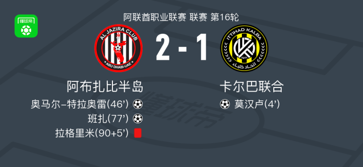 北京时间2月14日阿联酋职业联赛 联赛 第16轮,阿布扎比半岛主场对阵卡尔巴联合。阿布扎比半岛奥马尔-特拉奥雷破门,班扎破门。卡尔巴联合莫汉卢破门。最终比分阿布扎比半岛 2-1 阿尔伊蒂哈德卡尔巴。