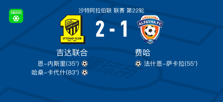北京时间2月14日沙特阿拉伯联 联赛 第22轮,吉达联合主场对阵费哈。吉达联合恩-内斯里破门,哈桑-卡代什破门。费哈法什恩-萨卡拉破门。最终比分吉达联合 2-1 费哈。