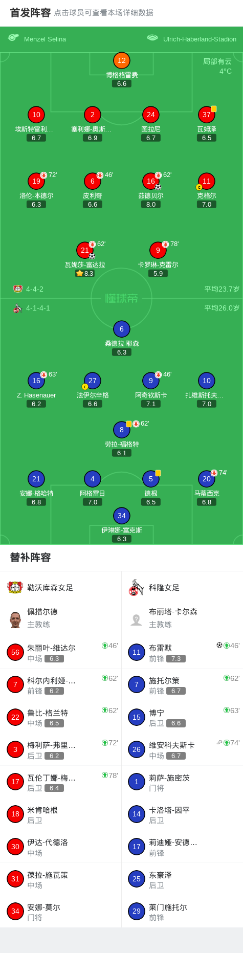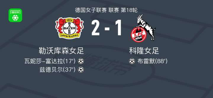 勒沃库森女足2-1科隆女足,兹德贝尔建功,瓦妮莎-富达拉破门