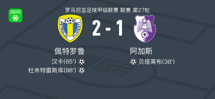 北京时间2月14日罗马尼亚足球甲级联赛 联赛 第27轮,佩特罗鲁主场对阵阿加斯。佩特罗鲁汉卡破门,杜米特雷斯库破门。阿加斯贝塔莱布破门。最终比分佩特罗鲁 2-1 阿加斯。