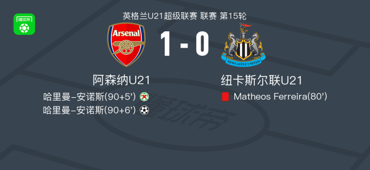 北京时间2月14日英格兰U21超级联赛 联赛 第15轮,阿森纳U21主场对阵纽卡斯尔联U21。阿森纳U21哈里曼-安诺斯破门。最终比分阿森纳U21 1-0 纽卡斯尔联U21。