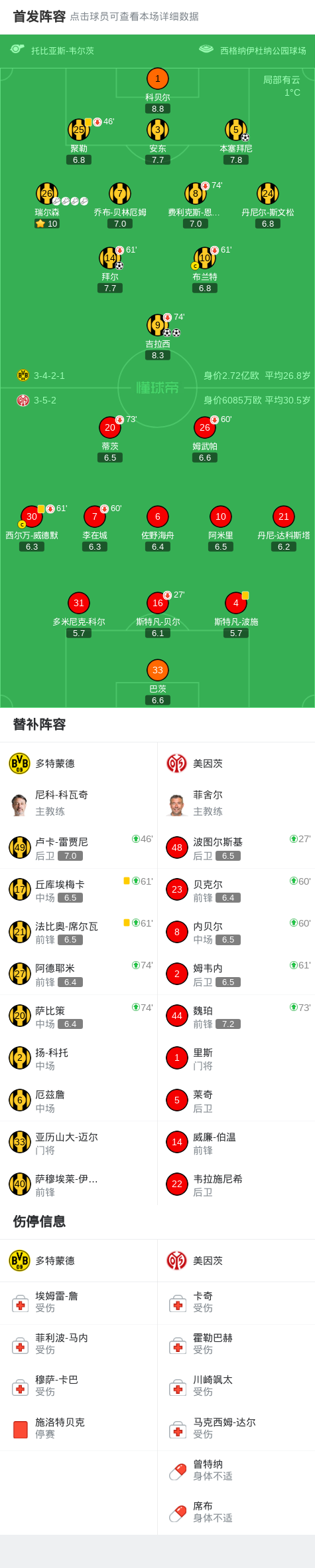 第73分钟,多特换人调整,萨比策、阿德耶米替补上场