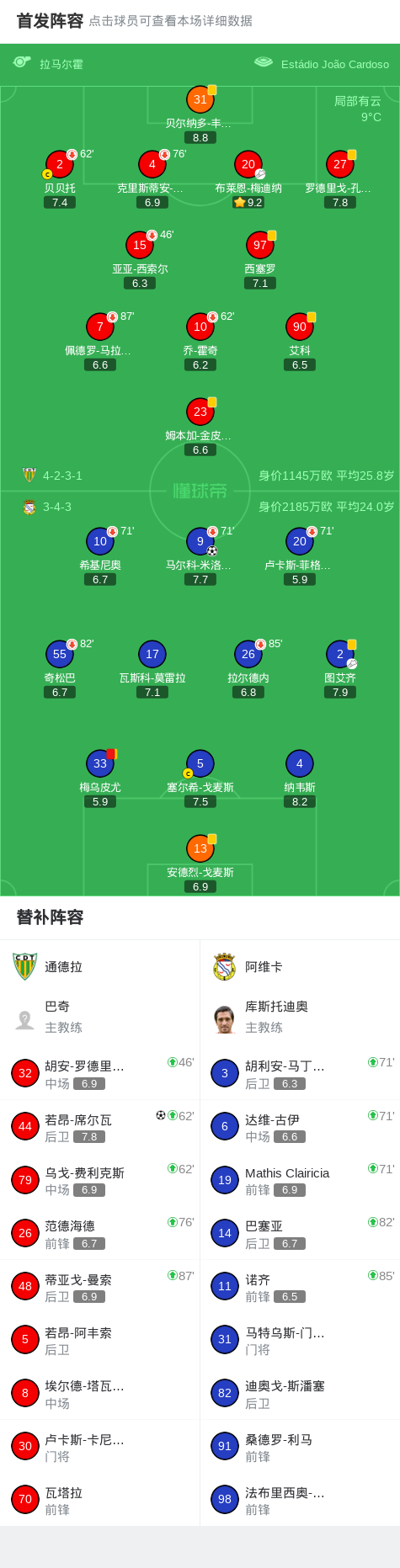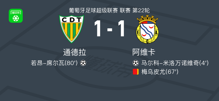 北京时间2月14日葡萄牙足球超级联赛 联赛 第22轮,通德拉主场对阵阿维卡。通德拉若昂-席尔瓦破门。阿维卡马尔科-米洛万诺维奇破门。最终比分通德拉 1-1 阿维卡。