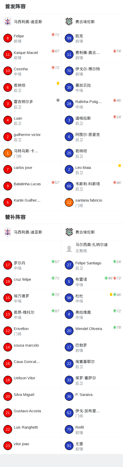 马西利奥-迪亚斯1-0费古埃伦斯,雷吉纳尔多制胜球战报bot @懂球帝02-14 08:26北京时间2月14日巴西圣卡塔琳娜甲级联赛 降级组 第3轮,马西利奥-迪亚斯主场对阵费古埃伦斯。马西利奥-迪亚斯雷吉纳尔多破门。最终比分马西利奥-迪亚斯 1-0 费古埃伦斯。点击查看本场比赛详细数据>>精彩瞬间第31分钟,马西利奥-迪亚斯球员雷吉纳尔多打入一球。 球队阵容 技术统计 展开更多