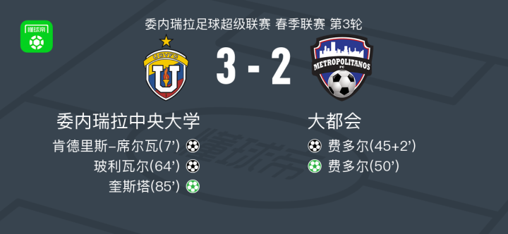 北京时间2月14日委内瑞拉足球超级联赛 春季联赛 第3轮,委内瑞拉中央大学主场对阵大都会。委内瑞拉中央大学肯德里斯-席尔瓦破门,玻利瓦尔破门,奎斯塔破门。大都会费多尔梅开二度。最终比分委内瑞拉中央大学 3-2 大都会。