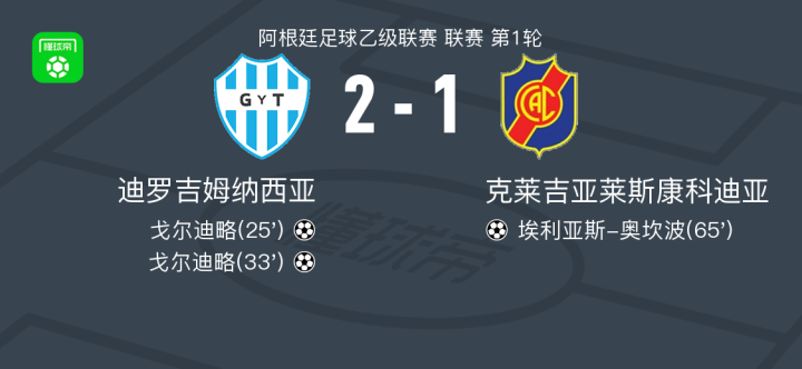北京时间2月14日阿根廷足球乙级联赛 联赛 第1轮,迪罗吉姆纳西亚主场对阵克莱吉亚莱斯康科迪亚。迪罗吉姆纳西亚戈尔迪略梅开二度。克莱吉亚莱斯康科迪亚埃利亚斯-奥坎波破门。最终比分迪罗吉姆纳西亚 2-1 克莱吉亚莱斯康科迪亚。
