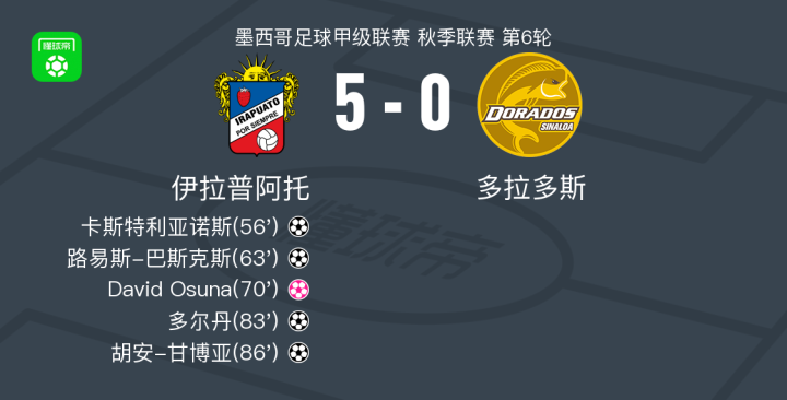 北京时间2月14日墨西哥足球甲级联赛 秋季联赛 第6轮,伊拉普阿托主场对阵多拉多斯。伊拉普阿托卡斯特利亚诺斯破门,路易斯-巴斯克斯破门,多尔丹破门,胡安-甘博亚破门。多拉多斯David Osuna自摆乌龙。最终比分伊拉普阿托 5-0 多拉多斯。