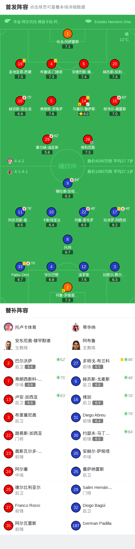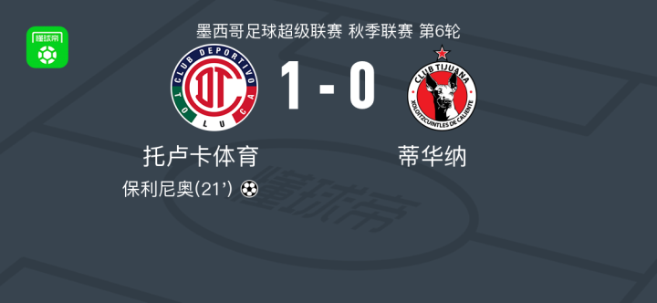 北京时间2月14日墨西哥足球超级联赛 秋季联赛 第6轮,托卢卡体育主场对阵蒂华纳。托卢卡体育保利尼奥破门。最终比分托卢卡体育 1-0 蒂华纳。