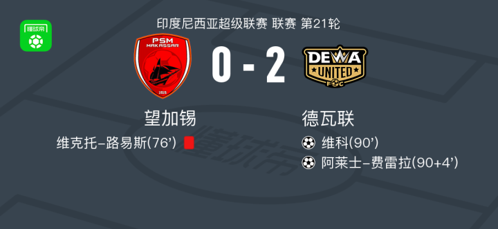北京时间2月14日印度尼西亚超级联赛 联赛 第21轮,望加锡主场对阵德瓦联。德瓦联维科破门,阿莱士-费雷拉破门。最终比分望加锡 0-2 德瓦联。