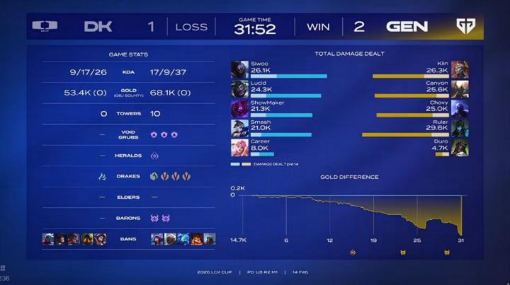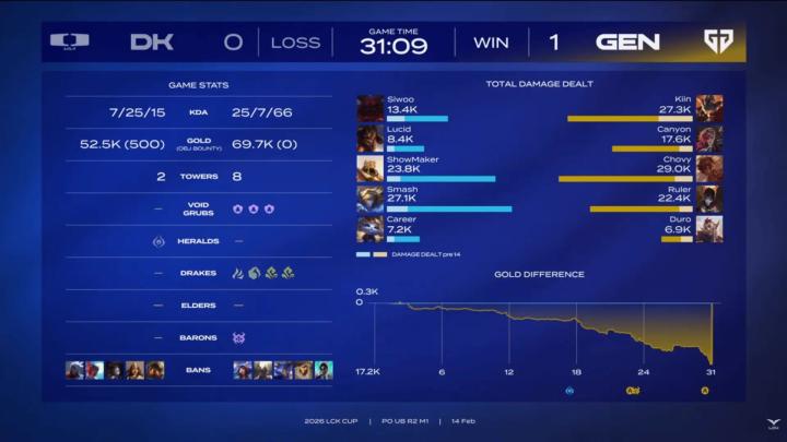 第四局DK在拥有优势的情况下,被Chovy阿萝拉接管比赛,打出巨大中路Gap。后期伤害爆炸的阿萝拉已完全不可阻挡,带领GEN3-1取胜!