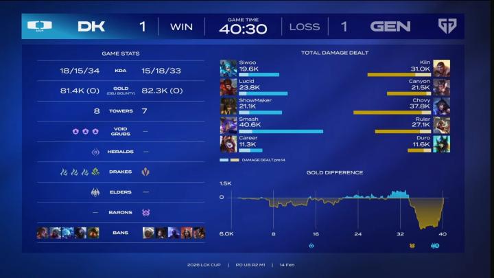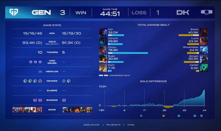 北京时间2月14日,LCK第一赛段淘汰赛中,GEN迎战DK。最终GEN延续了面对DK的巨大历史优势,3-1完成对DK的21连胜,闯进LCK胜者组决赛。他们将等待明日T1与BFX的胜者作为对手,再赢一个BO5即可晋级先锋赛。
