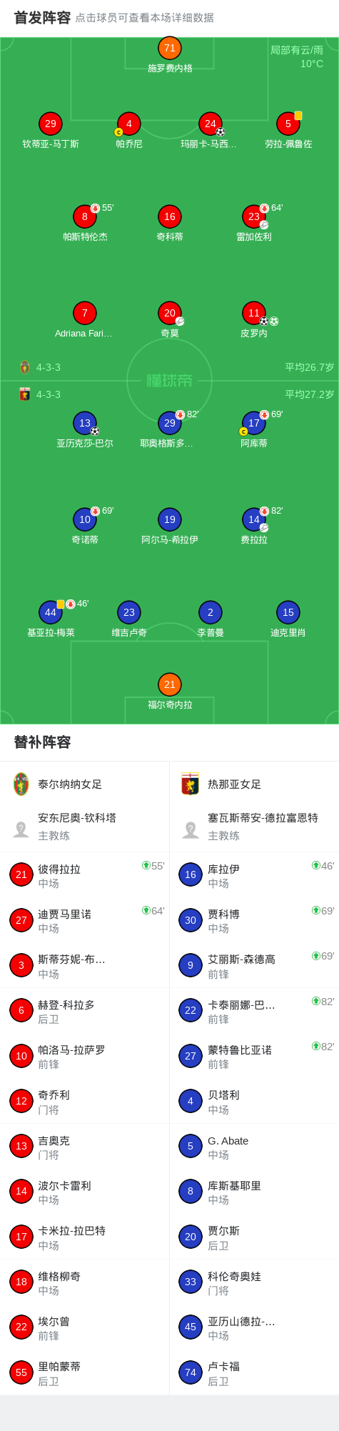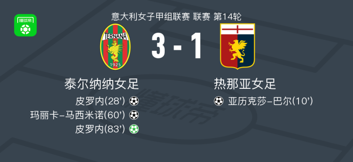 泰尔纳纳女足3-1逆转热那亚女足,皮罗内梅开二度,玛丽卡-马西米诺建功