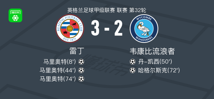 北京时间2月14日英格兰足球甲级联赛 联赛 第32轮,雷丁主场对阵韦康比流浪者。雷丁马里奥特帽子戏法。韦康比流浪者丹-凯西破门,哈格尔斯克破门。最终比分雷丁 3-2 韦康比流浪者。
