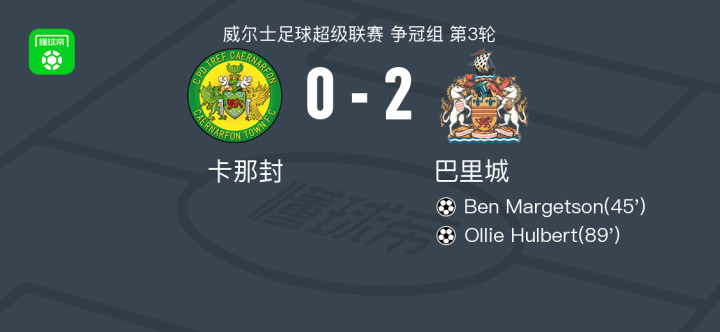 北京时间2月14日威尔士足球超级联赛 争冠组 第3轮,卡那封主场对阵巴里城。巴里城Ben Margetson破门,Ollie Hulbert破门。最终比分卡那封 0-2 巴里城。